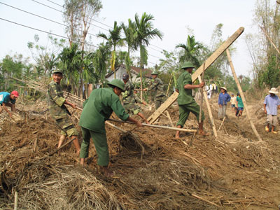 Cán bộ, học viên trường Quân sự Quân khu 5 giúp nhân dân huyện Duy Xuyên (Quảng Nam) khắc phục hậu quả sau bão số 9.