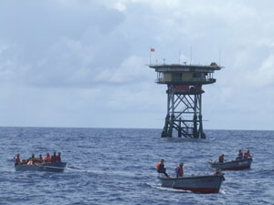 Sóng biển mạnh khiến đoàn công tác không thể vào được nhà giàn DK1 thuộc bãi Phúc Nguyên.