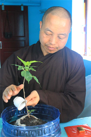 | Thượng tọa Thích Thanh Huân rắc cát sông Hằng xuống gốc cây bồ đề. |