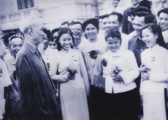 | Anh hùng Lao động Phạm Thị Vách (thứ hai, từ phải sang) trong lần được gặp Bác Hồ tại Đại hội liên hoan Anh hùng, chiến sĩ thi đua toàn quốc lần thứ III, năm 1962. Ảnh tư liệu |