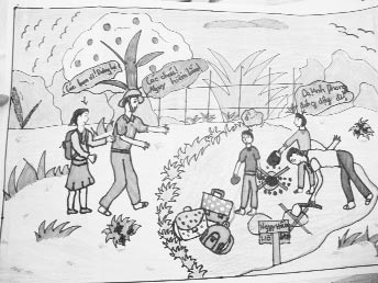 Một bức tranh đoạt giải cuộc thi vẽ tranh phòng chống tai nạn bom mìn ở Trường tiểu học Tân Long.