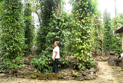 | Bà Đáng bên vườn tiêu của gia đình. |
