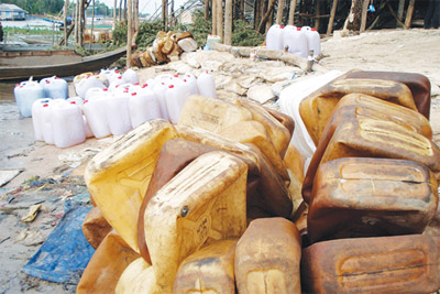 Can nhựa đầy ắp xăng dầu và vỏ can nằm la liệt ở bãi tập kết trên bờ kênh Vĩnh Tế