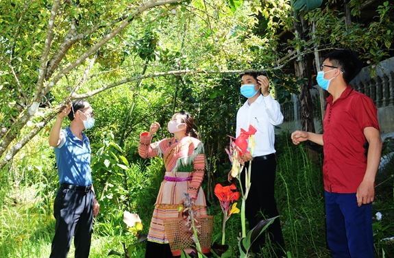 Đồng chí Lương Hải Hưng (thứ hai, từ phải sang), công chức văn phòng của UBND xã Tả Van Chư (Bắc Hà, Lào Cai), nguyên đội viên Dự án 600, giới thiệu mô hình trồng mận Tả Van. Ảnh: VIỆT HÀ
