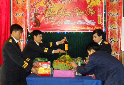 Tới Trạm ra-đa B85, chúng tôi gặp bà Nguyễn Thị Quý ở bản Cuối, xã Bản Sen tới chúc Tết và cảm ơn cán bộ, chiến sĩ đã giúp gia đình vận chuyển vật liệu, đổ mái để bà và các con cháu được đón Xuân, vui Tết trong ngôi nhà mới. Bà mang theo lồng gà tặng Bộ đội Hải quân ăn tết. Thượng úy Nguyễn Xuân Tùng, Chính trị viên Trạm xin nhận tấm lòng của bà Quý, còn lồng gà anh gửi lại để gia đình đón Tết... Khi đoàn công tác tới thăm hỏi, tặng quà cấp ủy, chính quyền địa phương, ông Lê Hồng Phương, Chủ tịch UBND xã Bản Sen vui mừng thông báo: “Tỷ lệ hộ nghèo trong xã giảm từ 70,3% (năm 2003) xuống còn 18% (cuối năm 2010); hơn 80% số hộ dân có nhà xây. Để đạt được thành tích đó cấp ủy, chính quyền và người dân địa phương luôn nhắc đến công sức của bộ đội ra-đa Hải quân”. Rồi ông Phương kể: “Trong ngày nghỉ, giờ nghỉ các anh đều đến tư vấn, hướng dẫn giúp đỡ các hộ gia đình trong xã tăng gia sản xuất như nuôi dê, lợn, gia cầm, hải sản để phát triển kinh tế gia đình. Các công việc nặng nhọc như đào móng xây nhà, vận chuyển vật liệu, đổ mái... cán bộ, chiến sĩ trạm luôn có mặt kịp thời giúp đỡ chính quyền và người dân địa phương…”. Cũng theo ông Phương: “Tên của các anh bộ đội ra-đa Hải quân bà con thuộc như người trong gia đình mình. Cứ mỗi dịp Tết đến, Xuân về, quân dân xã đảo lại cùng nhau thịt lợn, gói bánh chưng, đón Giao thừa, tổ chức các trò chơi dân gian truyền thống… vui như ngày hội”.