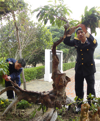 | Cán bộ, chiến sĩ Trạm ra-đa B80 đảo Trần chăm sóc cây cảnh đón Tết nguyên đán. |