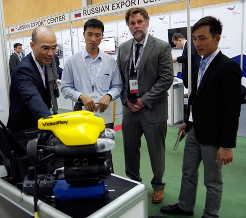Nhân viên hãng chế tạo ROVs giới thiệu về robot làm nhiệm vụ tìm kiếm, đo độ sâu dưới nước bằng phương pháp điểu kiền từ xa.