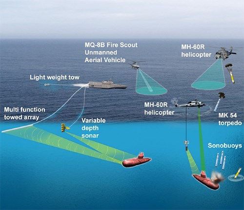 Với tốc độ hải trình cao tới 40 hải lý/giờ, các chiến hạm LCS có nhiều lợi thế trong tác chiến chống ngầm. Khả năng cơ động cao cho phép LCS tránh được các đòn tấn công bất ngờ của tàu ngầm đối phương, cũng như tiếp cận vị trí nghi ngờ có tàu ngầm đối phương hoạt động nhanh chóng. Cùng với đó, hệ thống VDS phối hợp với trực thăng săn ngầm MH-60, các tổ hợp máy bay không người lái trên chiến hạm LCS sẽ cung cấp cung cấp tình hình tác chiến theo mốc thời gian thực. Hiệu quả tác chiến chống ngầm còn được tăng thêm, khi hệ thống này phối hợp với máy bay tuần thám hải quân tầm xa P-8A Poseidon.