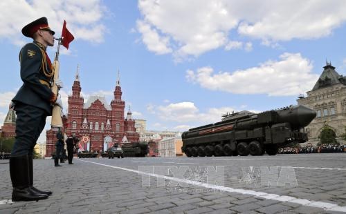 Thiết bị phóng tên lửa đạn đạo chiến lược RS-24 Yars của Nga trong lễ tổng duyệt duyệt binh diễu hành mừng 71 năm Ngày Chiến thắng tại Quảng trường Đỏ ở thủ đô Moskva ngày 7-5. Ảnh: TTXVN.