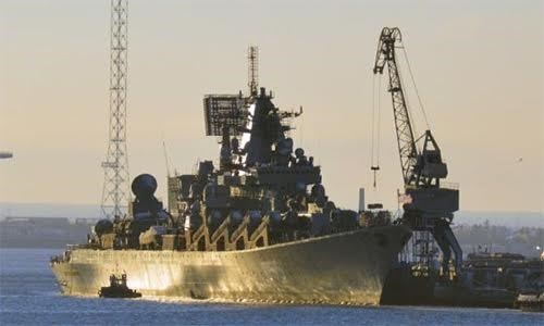 Tuần dương hạm Admiral Ustinov tại cơ sở của Trung tâm sửa chữa Zvezdochka, nơi chuyên sửa chữa và nâng cấp chiến hạm, tàu ngầm hạng nặng của Nga.