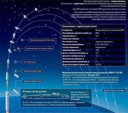 Được thiết kế để phóng từ tàu ngầm, tên lửa Bulava R30 3М30 (tên NATO - SS-NX-30, tên trên các văn bản quốc tế - РСМ-56) có kết cấu 3 tầng sử dụng nhiên liệu rắn với tầm bắn đạt khoảng 8.000 km.