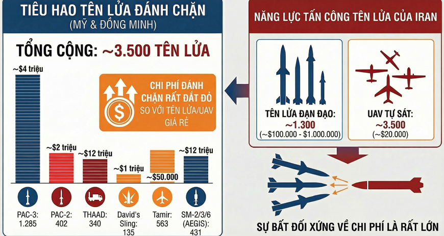 Về phía Iran, Tehran đã phóng không dưới 1.300 tên lửa đạn đạo và khoảng 3.500 UAV tự sát vào các mục tiêu trên toàn Trung Đông. Điều này đồng nghĩa với việc để hạ gục mỗi tên lửa đạn đạo do Iran phóng, Mỹ và các đồng minh phải sử dụng 2-3 tên lửa đánh chặn đắt tiền, đó là chưa kể lượng đạn tiêu hao để ngăn chặn bầy đàn UAV tự sát.