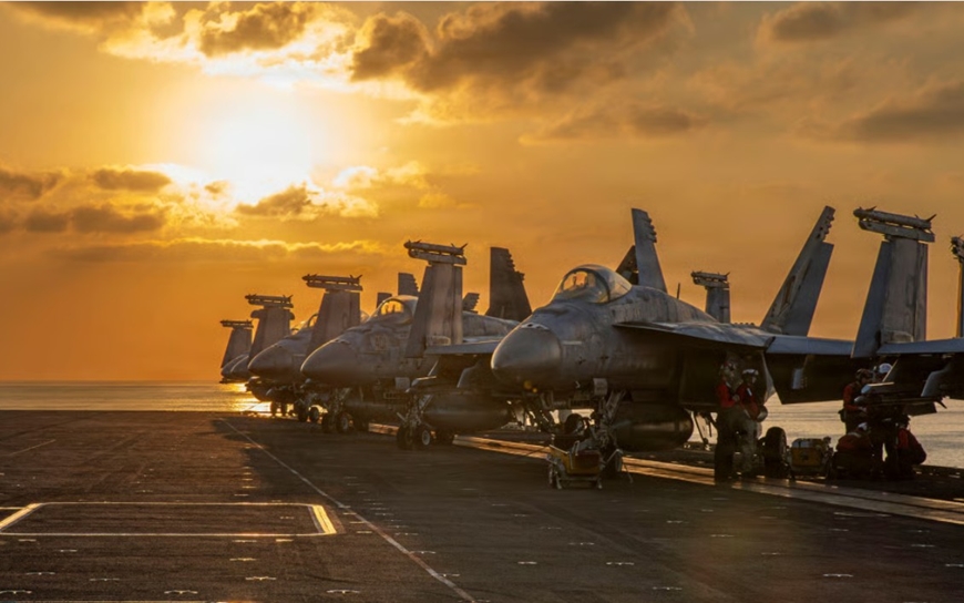 Máy bay chiến đấu của Hải quân Mỹ đậu trên boong tàu USS Abraham Lincoln vào ngày 3-3-2026, trước một chuyến bay đêm trong chiến dịch quân sự “Cơn thịnh nộ sử thi”. Ảnh: Reuters