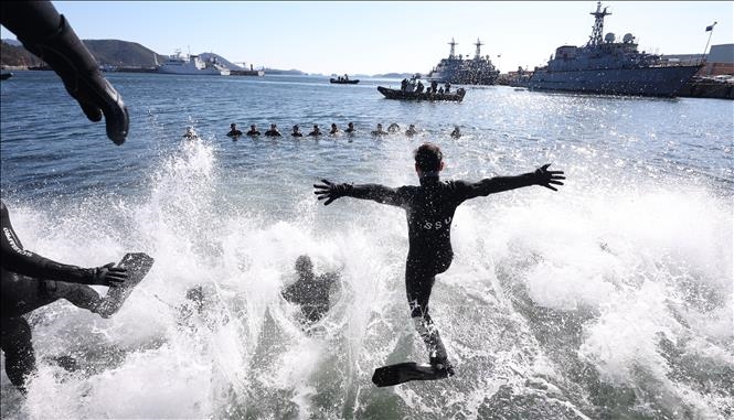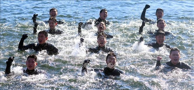 | Các thợ lặn sâu thuộc đơn vị Cứu hộ và Trục vớt Biển (SSU) - đơn vị tinh nhuệ của Hải quân Hàn Quốc tham gia huấn luyện cứu hộ dưới nước tại vùng biển ngoài khơi thành phố Changwon ngày 22-1-2026. |