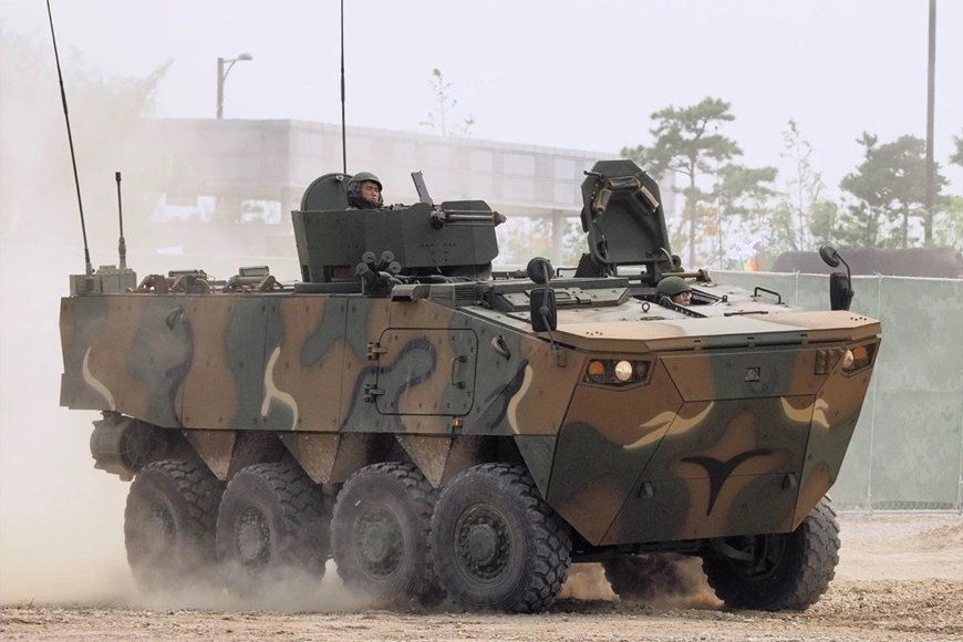 | K808 là xe thiết giáp chở quân 8×8, với trọng lượng chiến đấu khoảng 20 tấn và thiết kế truyền thống với động cơ đặt phía trước và khoang chở quân phía sau. Ảnh: Quân đội Hàn Quốc |