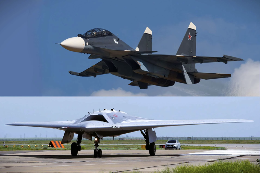 | Tiêm kích đa năng Su-30SM và máy bay chiến đấu tàng hình không người lái S-70 Okhotnik. Ảnh: Rostec/Russian Social Media |