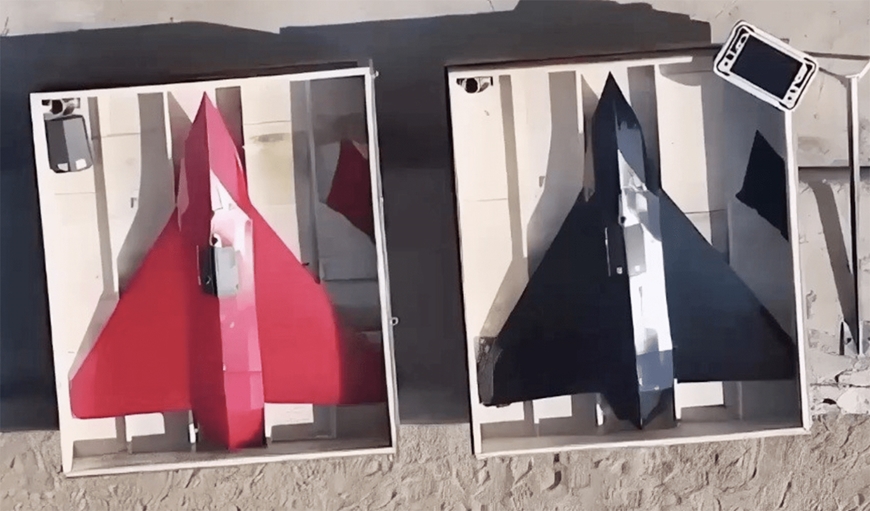 Hai chiếc UAV Hadid-110 của Iran được sơn màu đỏ và đen tại khu vực thử nghiệm. Ảnh: Odin