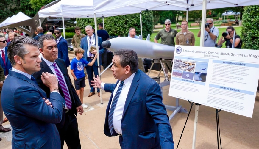 | Bộ trưởng Chiến tranh Mỹ Pete Hegseth nghe giới thiệu về UAV LUCAS trong một sự kiện tại Lầu Năm Góc vào tháng 7-2025. Ảnh: Business Insider |