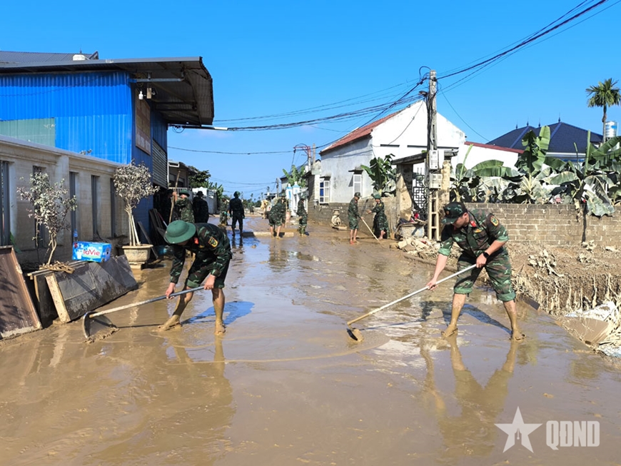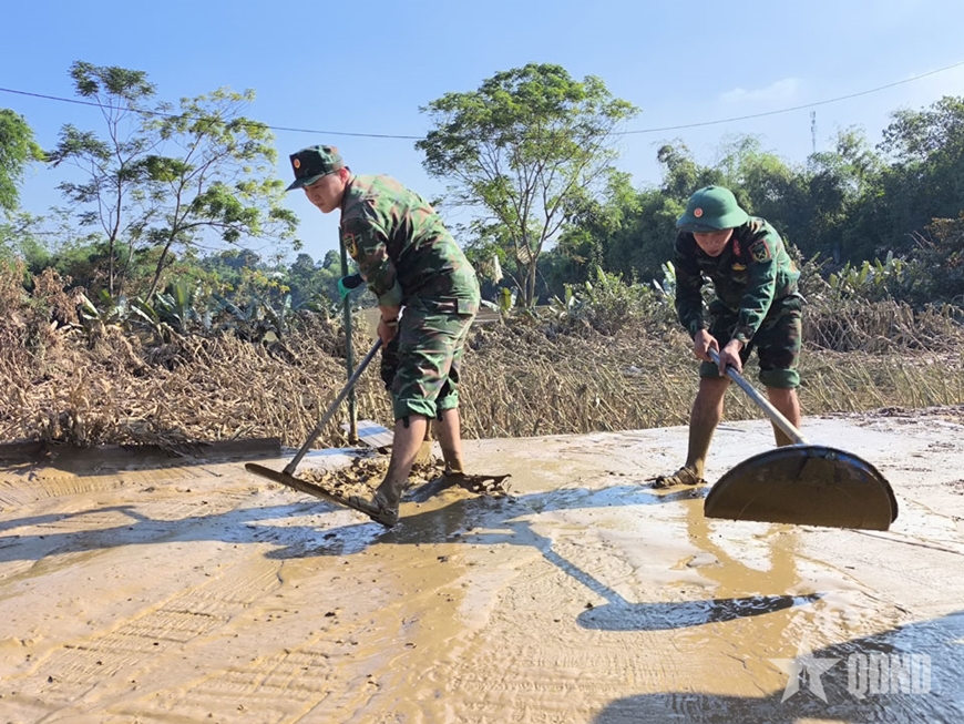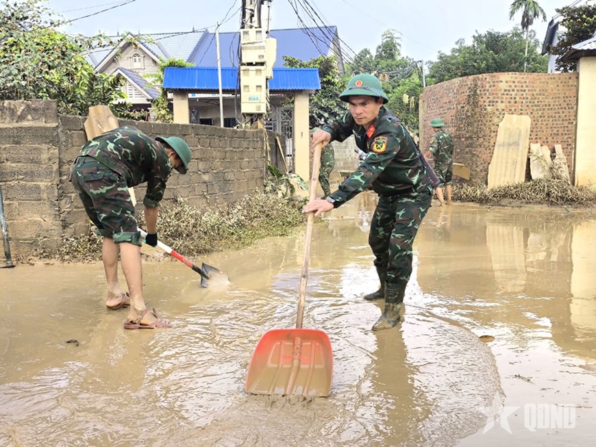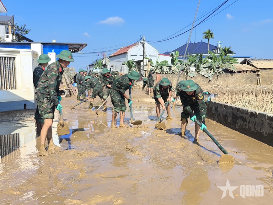 Cán bộ, chiến sĩ Lữ đoàn Đặc công 113 giúp nhân dân san gạt bùn đất, vệ sinh môi trường. |