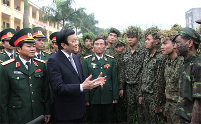 Chủ tịch nước Trương Tấn Sang trò chuyện với cán bộ, chiến sĩ Đoàn đặc công 1 (Binh chủng Đặc công).