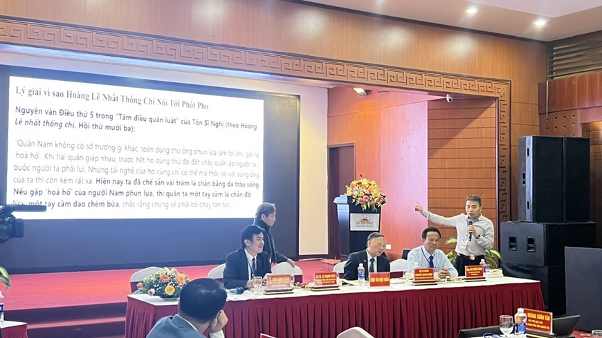 Kỹ sư Vũ Đình Thanh thuyết trình bằng chứng vũ khí phốt pho trong đoạn trích sử liệu từ Hoàng Lê Nhất Thống chí.