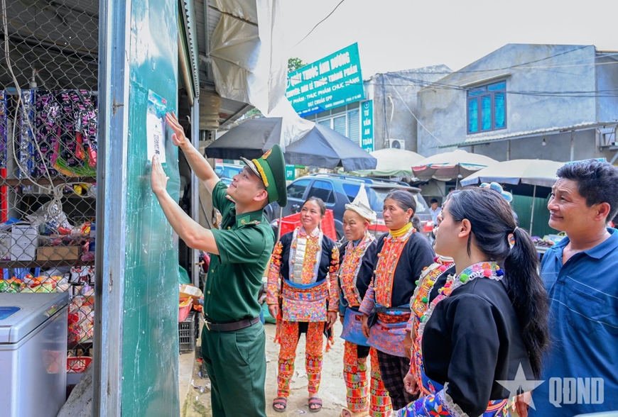 | Cán bộ Đồn Biên phòng Vàng Ma Chải dán mã QR chứa hòm thư điện tử ẩn danh tại chợ Sì Choang, xã Sì Lở Lầu. |