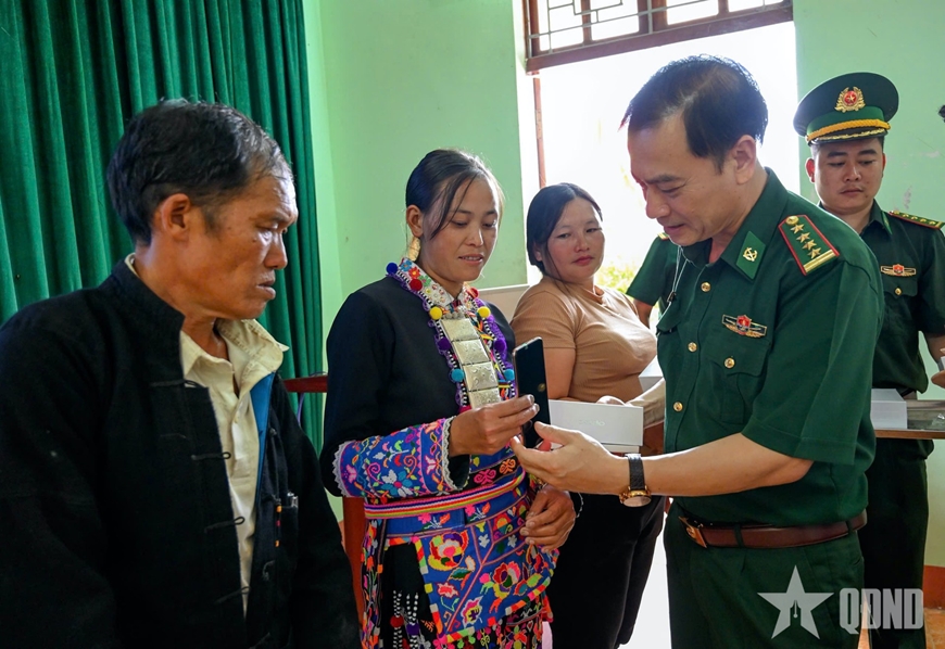 | Đại tá Nguyễn Văn Hưng, Bí thư Đảng ủy, Chính ủy Ban chỉ huy Bộ đội Biên phòng tỉnh Lai Châu tặng điện thoại thông minh cho nhân dân tại bản Sì Choang, xã Sì Lở Lầu. |