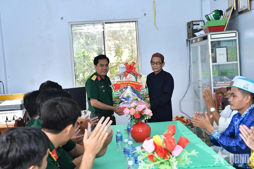 | Theo thông lệ hằng năm, mỗi dịp đến tháng lễ Ramadan của cộng đồng người Chăm, LLVT tỉnh An Giang luôn tổ chức thăm hỏi, tặng quà, thể hiện tinh thần đoàn kết giữa LLVT và cộng đồng Chăm. |