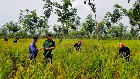 Với phương châm “bám thôn làng, bám dân, tiếp sức giúp bà con phát triển kinh tế, ổn định cuộc sống”, cùng với đó, đơn vị còn hỗ trợ hạt giống, phân bón và đầu tư phát triển kinh tế hộ gia đình, trồng cây “lấy ngắn nuôi dài”. Nếu trước đây bà con trồng lúa bằng cách chọc lỗ, bỏ hạt, khi lúa chín thì dùng liềm gặt về đập, tuốt… Đến nay, điều ngạc nhiên và đáng mừng là nhiều gia đình đã biết dùng xe gặt - đập để đưa vào thu hoạch lúa. Ngày trước tuốt xong lúa, bà con vứt hoặc đốt rơm, rạ khói bay mù mịt, ô nhiễm môi trường, còn bây giờ rơm được người dân cho lên xe công nông chở về, số cho trâu bò ăn, vun gốc cà phê, hồ tiêu. Với mô hình “Giúp dân trồng lúa trên đất tái canh cây cao su” của Binh đoàn 15 nói chung, Công ty 72 nói riêng, thì đến nay đã có hàng ngàn hộ gia đình đồng bào DTTS trên vùng biên giới Gia Lai được hưởng lợi từ hiệu quả của mô hình này mang lại.