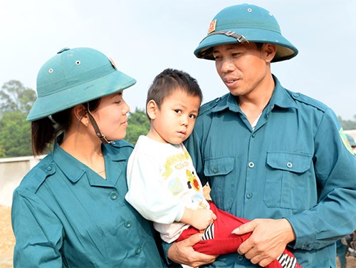 Trò chuyện với cặp vợ chồng chiến sĩ dân quân, chúng tôi lại nhớ lần về Hà Châu tháng 5-2017. Trên thao trường nắng nóng, đội hình dân quân xã Hà Châu say sưa luyện tập đội ngũ và ném lựu đạn, trong đó có vợ chồng Oanh-Nhất. Anh Nhất tâm sự: “Tôi là Thôn đội trưởng nên phải gương mẫu. Muốn động viên thanh niên tham gia dân quân thì phải động viên được người thân trong gia đình của mình tham gia trước”. Lý do nghe có vẻ đơn giản, nhưng thực hiện được có lẽ không hề dễ dàng, bởi anh chị có con nhỏ, nhà lại bán hàng, khi đi huấn luyện, cửa hàng phải đóng cửa còn con nhỏ phải gửi đi nhà trẻ. Giờ giải lao, có một cậu bé lon ton chạy đến sà vào lòng Oanh. Thì ra đó là cậu con trai út của anh chị. Cháu tên Nguyễn Văn Hiếu, 4 tuổi, học mẫu giáo gần đó, tranh thủ giờ nghỉ chạy ra xem bố mẹ luyện tập.