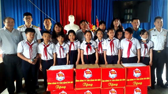 | Đại diện Tổng công ty Tân Cảng Sài Gòn trao quà tặng các em học sinh huyện Kon Rẫy (ảnh chụp trước ngày 27-4-2021). |