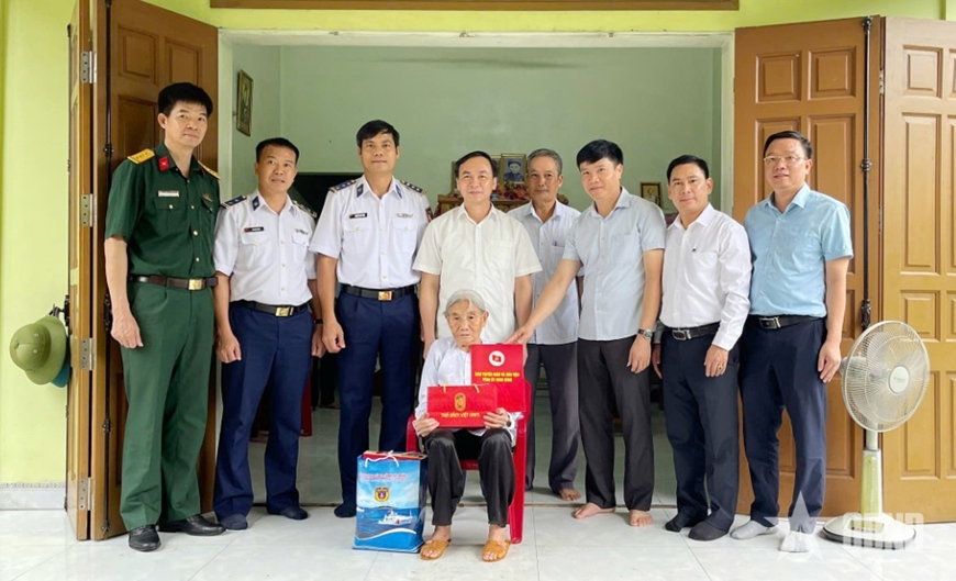 Đoàn công tác Vùng Cảnh sát biển 1 thăm, tặng quà Bà mẹ Việt Nam anh hùng Nguyễn Thị Tuyển ở xóm Bình Thượng, xã Phong Doanh.