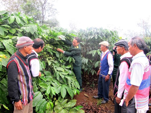 Già làng, trưởng thôn huyện Cư M'gar, tỉnh Đắc Lắc trao đổi kinh nghiệm trồng cây cà phê với Công ty TNHH MTV Cà phê 15 (Quân khu 5).