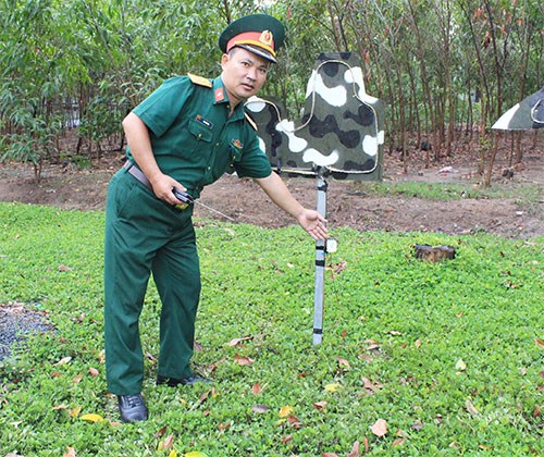 Trung tá Lâm Đắc Hậu giới thiệu mô hình“Cải tiến bộ bia huấn luyện chiến thuật ban đêm”.