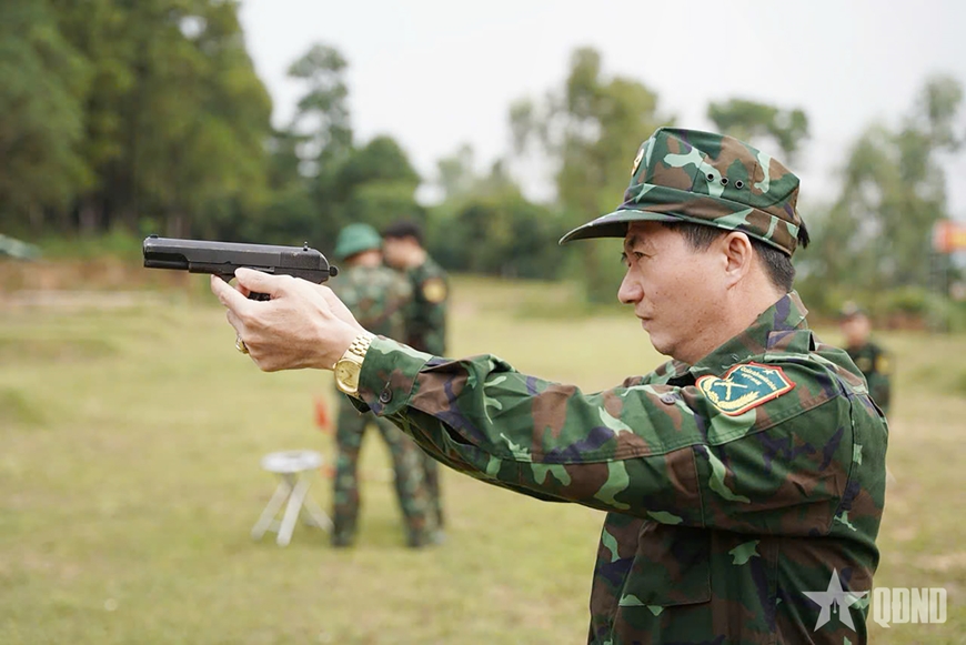 Đồng chí Hồ Quốc, Giám đốc - Chỉ huy trưởng Ban CHQS Công ty Cổ phần Than Vàng Danh - Vinacomin tích cực tham gia luyện tập nội dung bắn súng ngắn K54, bài 1 tại lớp bồi dưỡng kiến thức QPAN đối tượng 3 do Hội đồng giáo dục QPAN tỉnh Quảng Ninh tổ chức.