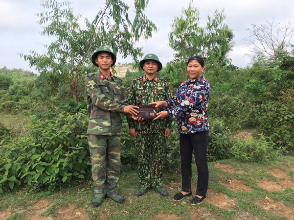 Binh nhất Lê Quang Hưởng (bên trái) cùng chỉ huy đơn vị bàn giao chiếc ví cho chị Nguyễn Thị Châu. |