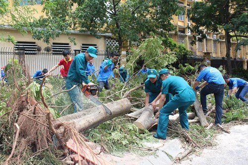 Dân quân TP Hà Nội tham gia khắc phục hậu quả dông lốc tháng 6-2015. Ảnh: Hiền Mỹ