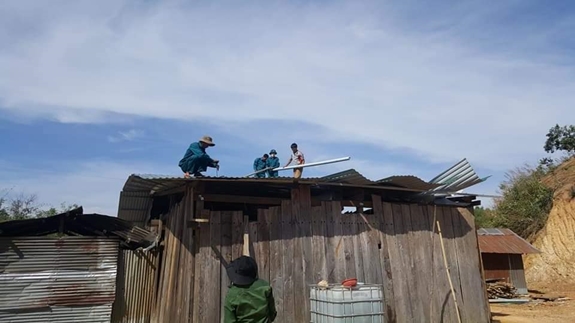 Dân quân xã Đăk Plao và Đắk R’măng giúp các hộ dân dựng lại nhà sau trận mưa lốc.
