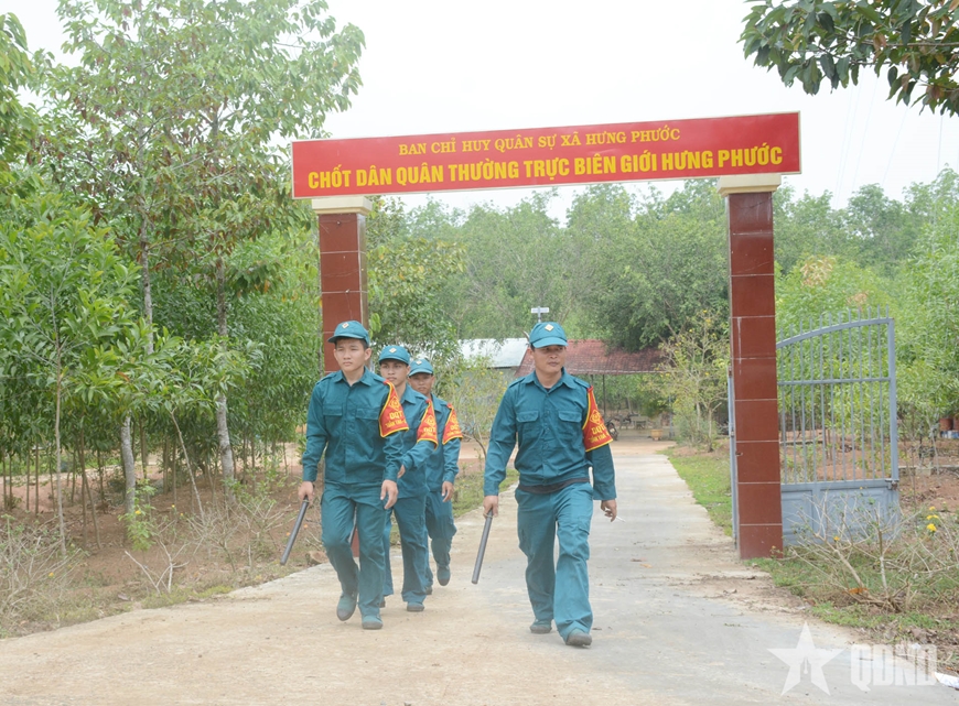 Cán bộ, chiến sĩ chốt dân quân thường trực Hưng Phước, xã Hưng Phước, tỉnh Đồng Nai tuần tra địa bàn.
