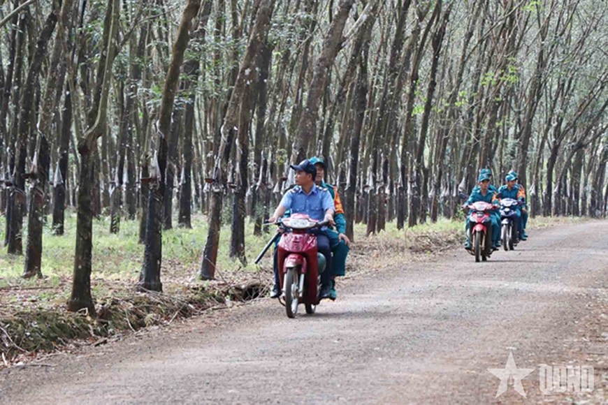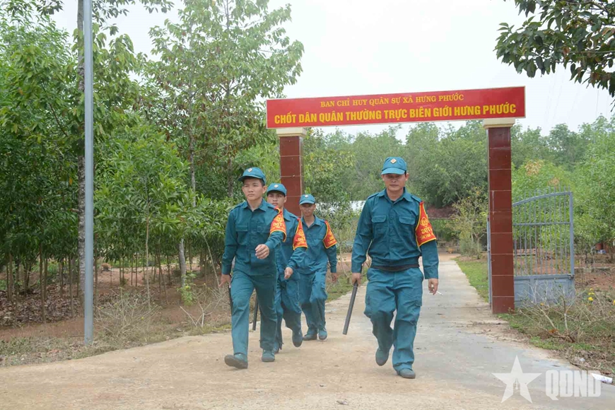 Cán bộ, chiến sĩ chốt dân quân thường trực biên giới Hưng Phước (Đồng Nai) tuần tra địa bàn vùng biên.