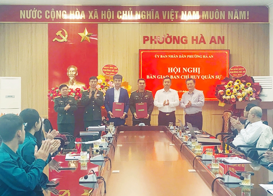 | UBND phường Hà An bàn giao Ban CHQS phường. (Đồng chí Nguyễn Văn Tuấn, nguyên Chỉ huy trưởng Ban CHQS phường Hà An, thứ 3 bên trái ảnh tiến hành bàn giao Ban CHQS phường) |