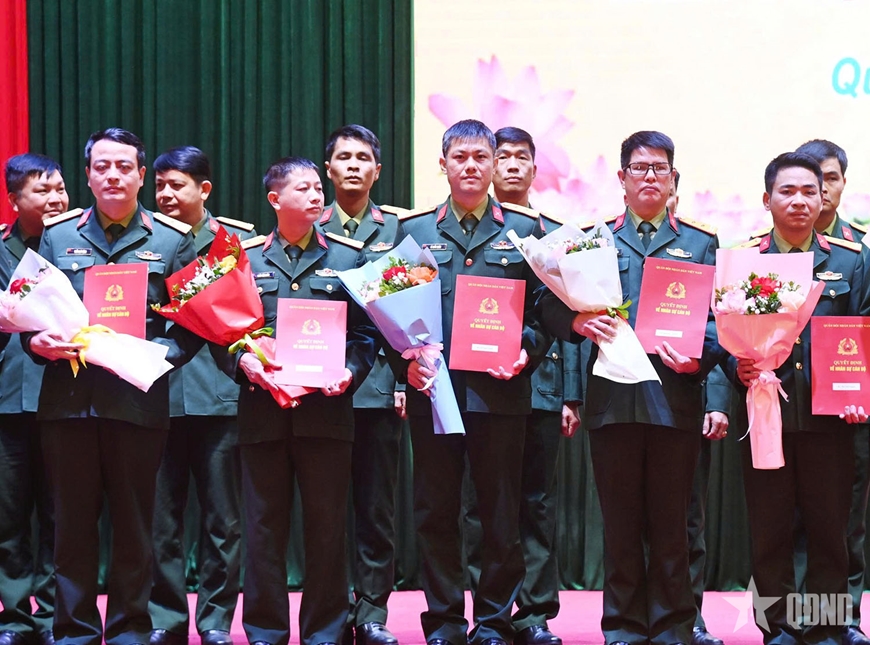 | Đại tá Lê Trọng Hòa, Ủy viên Ban Thường vụ Tỉnh ủy, Chỉ huy trưởng Bộ CHQS tỉnh; Đại tá Hoàng Văn Thuyết, Tỉnh ủy viên, Phó bí thư Thường trực Đảng ủy, Chính ủy Bộ CHQS tỉnh trao quyết định và tặng hoa chúc mừng các đồng chí cán bộ được bổ nhiệm, điều động giữ chức Chỉ huy phó, Chính trị viên phó, trợ lý Ban CHQS xã, phường, đặc khu. |