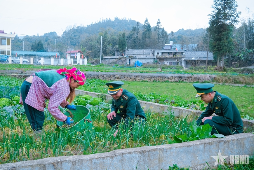 | Tuổi trẻ Bộ đội Biên phòng hướng dẫn người dân chăm sóc rau màu, phát triển sản xuất. |