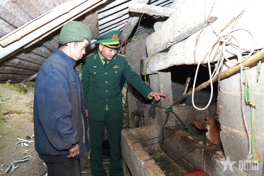 | Thượng úy Sèn Đức Hợp, cán bộ Trạm Biên phòng Cửa khẩu Săm Pun, hướng dẫn người dân phát triển chăn nuôi, nâng cao sinh kế vùng biên. |