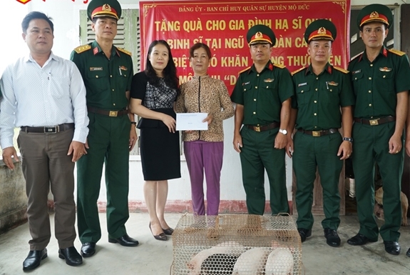 | Ban CHQS huyện Mộ Đức cùng các tổ chức đoàn thể địa phương hỗ trợ con giống và tặng quà gia đình chiến sĩ Dương Hồ Minh Duy, tháng 9-2020. |