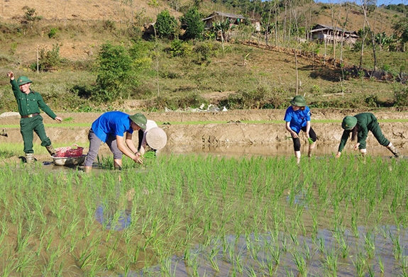 Cán bộ, nhân viên, trí thức trẻ tình nguyện Đoàn KT-QP 326 hướng dẫn, giúp người dân trồng lúa nước.