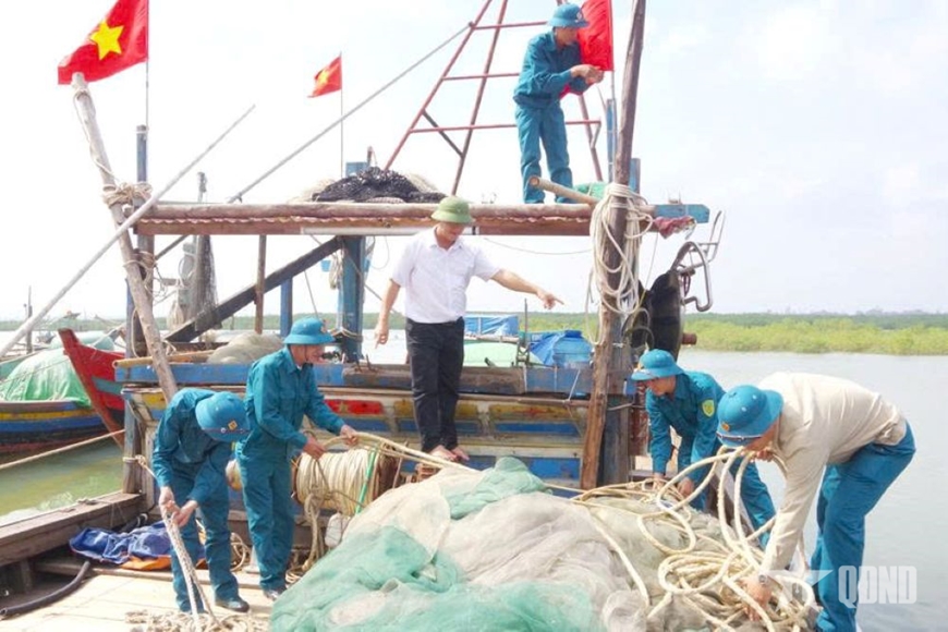 | Lực lượng dân quân biển xã Lộc Hà (Hà Tĩnh) hỗ trợ ngư dân chuẩn bị ngư cụ để ra khơi đánh bắt hải sản. |