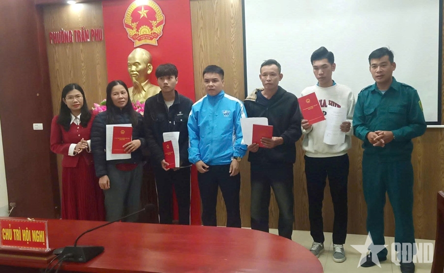 | Thanh niên Trần Văn Gia Huy (thứ hai từ phải qua), ở tổ dân phố Minh Yên, phường Trần Phú, Hà Tĩnh là thanh niên ưu tú tình nguyện viết đơn nhập ngũ đợt này. |