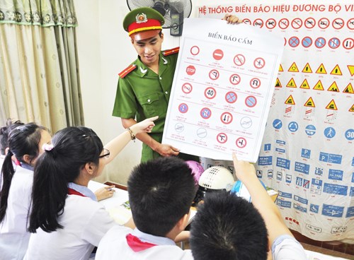 Hướng dẫn và phổ biến an toàn giao thông cho các em học sinh.