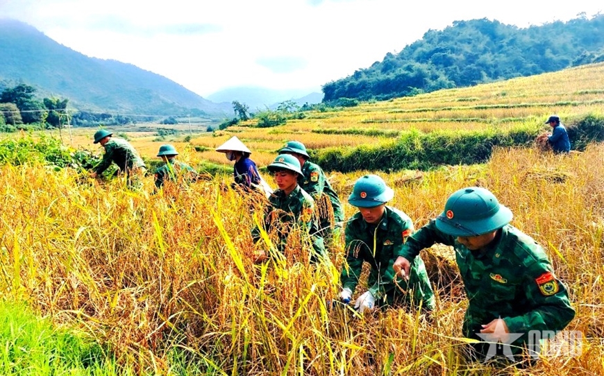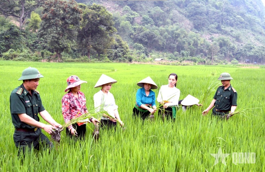 | Cán bộ, chiến sĩ Đồn Biên phòng Trung Lý cùng nhân dân trồng lúa nước hai vụ/năm. |
